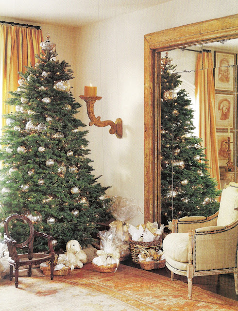 "Her nine-foot Noble fir tree, grown in North Carolina, graces the same spot in her living room every year. The tree is adorned with her favorite Neopolitan crèche figures, cream-colored balls, and white lights. A eighteenth-century Madonna santo presides over the room. When lit, the tree is visible from the street, through a series of arched French doors that are left curtainless."