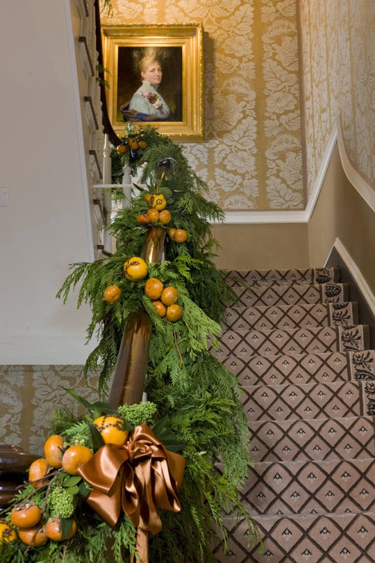 "The orange and green palette of the Lee Entrance Hall is carried over to the garland on the stairway banister."