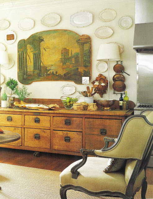 "English baker's counter. Vintage Italian chair in linen. Painting from 17th c. Seagrass rug."